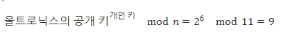 - 우선, 공개 키와 공통값(g, n)은 네트워크를 통해 공유