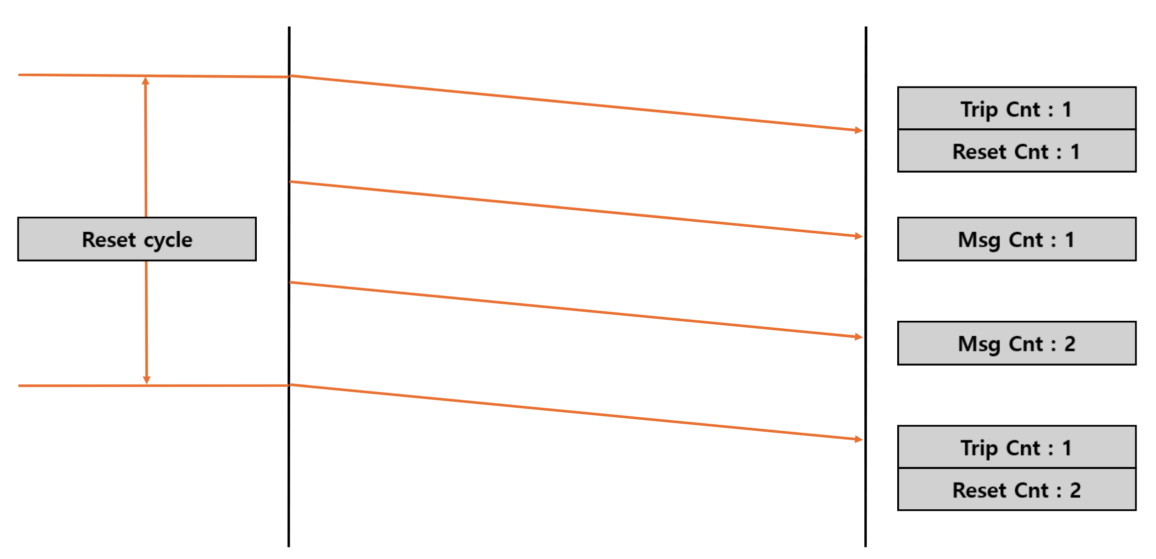 수신된 값(Trip Counter=0, Reset Counter=0)이 예상값과 일치하지 않으면, 수신자는 메시지를 무효 처리