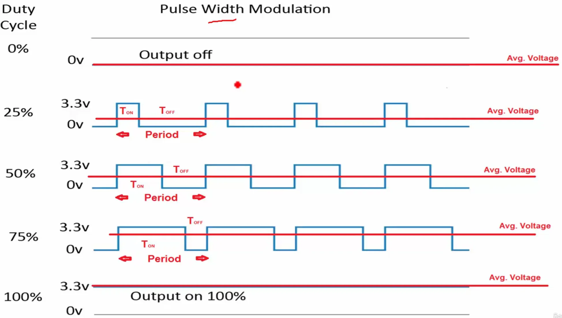 - Duty cycle : ON 시간의 비율, 여기서는 평균 전압이 3.3V의 절반인 1.65V