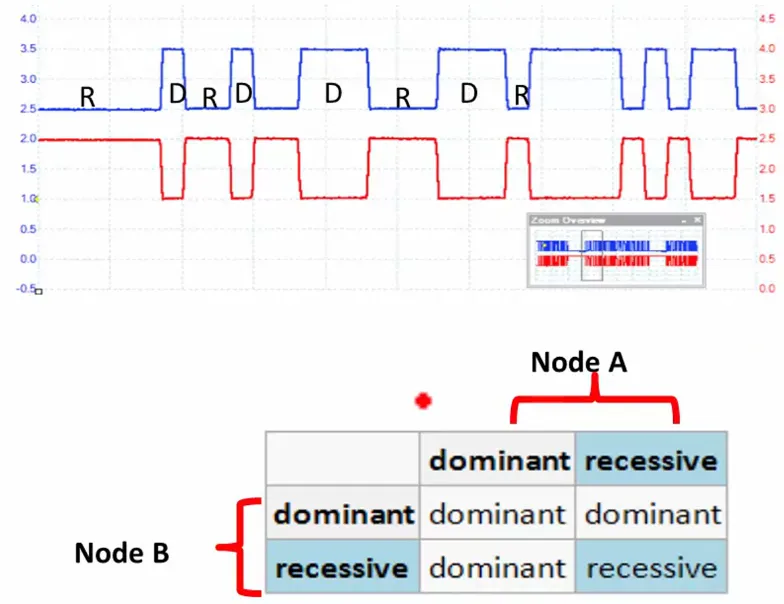 Since Dominant state of the bus means voltage difference of 2V, logic 0(dominant) always overrides logic 1(recessive) during data transfer