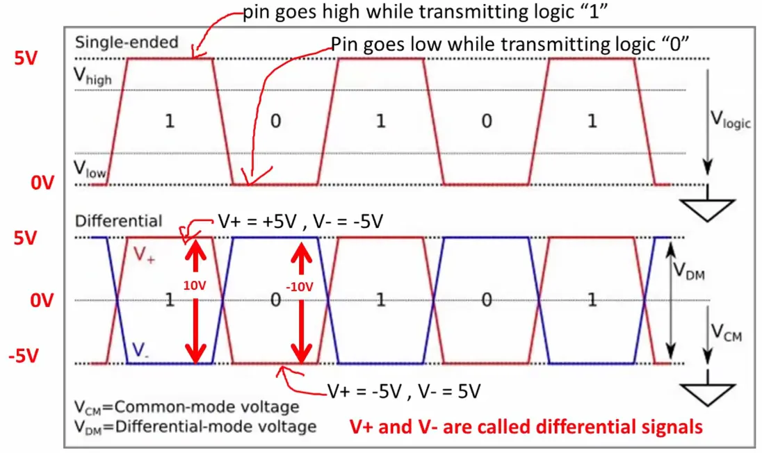 - 하지만 차동 신호는 두 신호 간의 전압 차이를 이용하여 데이터를 구별하기 때문에, 공통된 노이즈는 자동으로 제거됨 (Common-mode noise rejection)