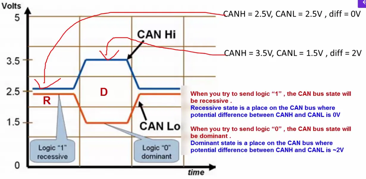 | Recessive (논리 1) | 1 | 2.3V | 2.3V | 0V |