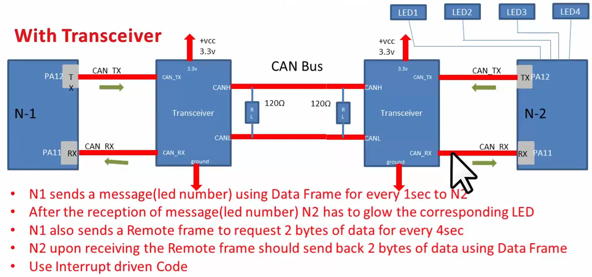 - N1은 1초마다 LED 번호를 CAN 데이터 프레임으로 N2에 전송