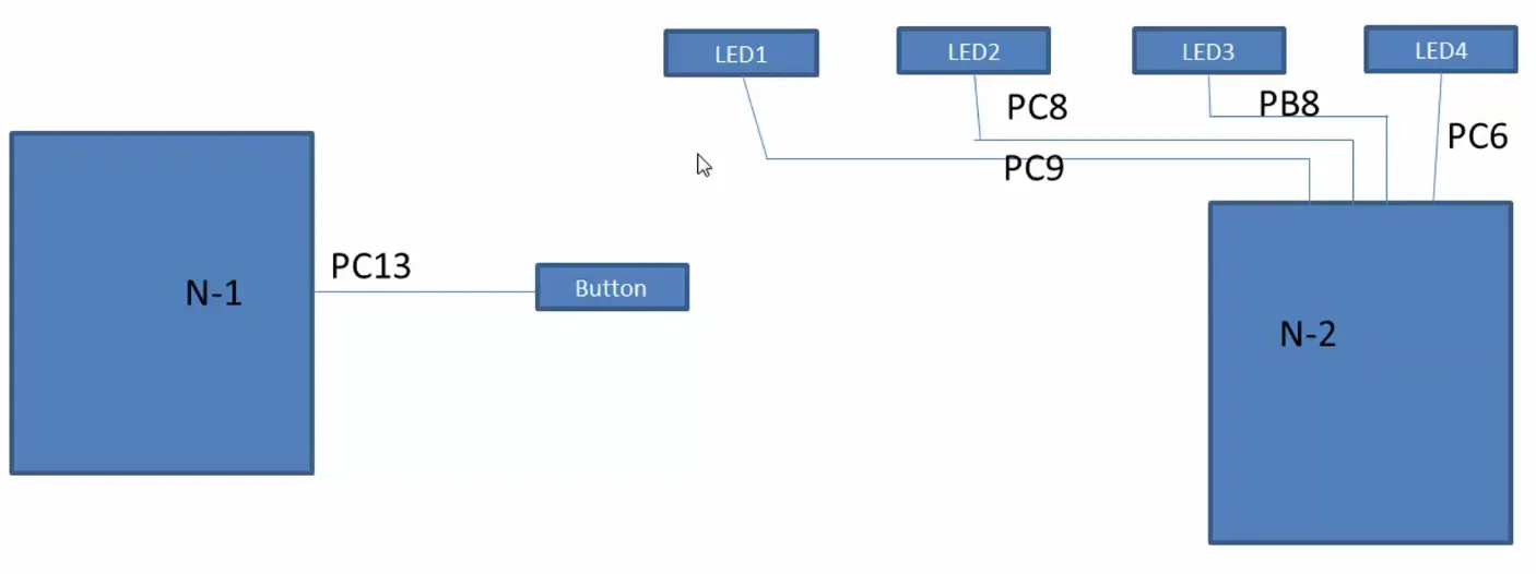 - N2 보드에 연결된 4개의 외부 LED(LED1, LED2, LED3, LED4)가 각각 다른 GPIO 핀에 연결