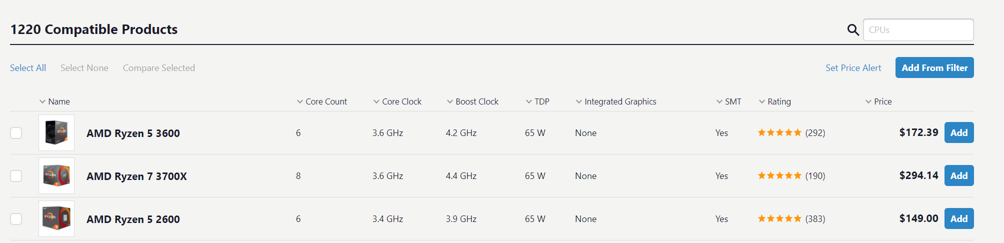 이때, 앞서 선택한 부품들을 기준으로 호환이 되는 부품이 자동으로 걸러져서 목록에 뜬다.