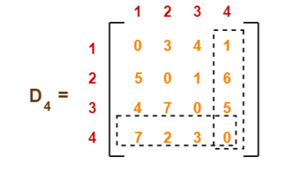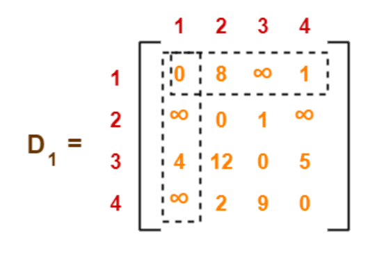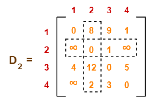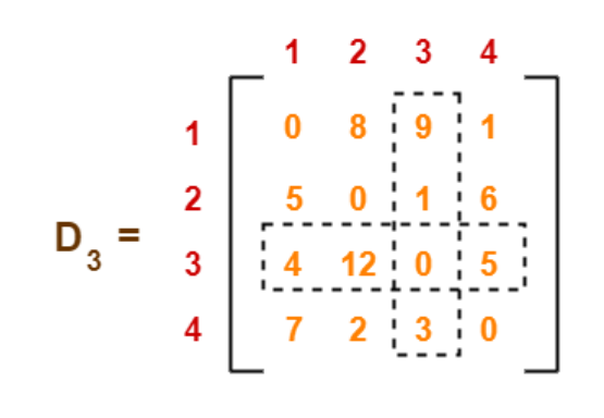 Fig. 2: Floyd-Warshall example. Newly updates entries are circled. - "All-Pairs Shortest Paths and the Floyd-Warshall Algorithm"
