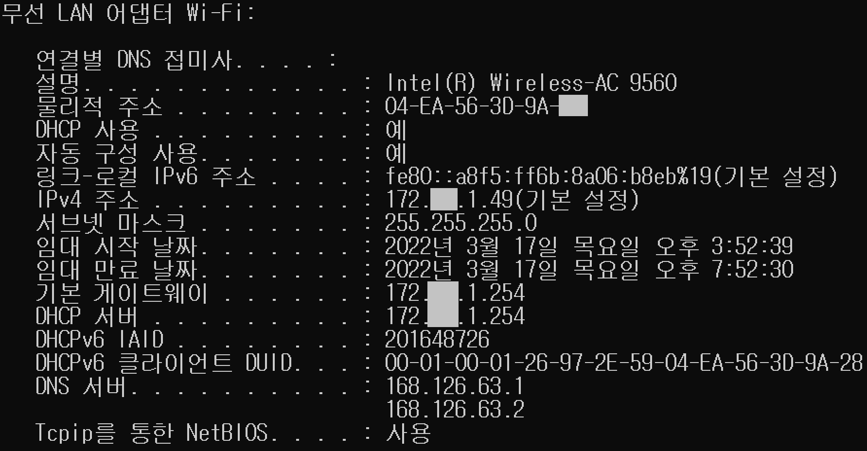 다음은 내 노트북에서 ipconfig/all 명령을 실행한 결과이다.