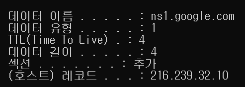 예상대로 DNS 캐시 테이블과 동일한 IP주소(216.239.32.10)가 찍힌다.