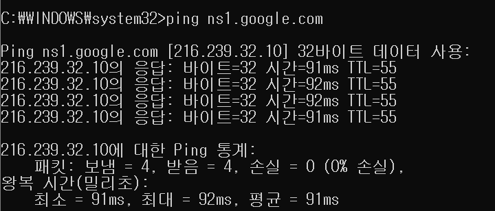 확인차 ns1.google.com 으로 ping을 찍어보았다.
