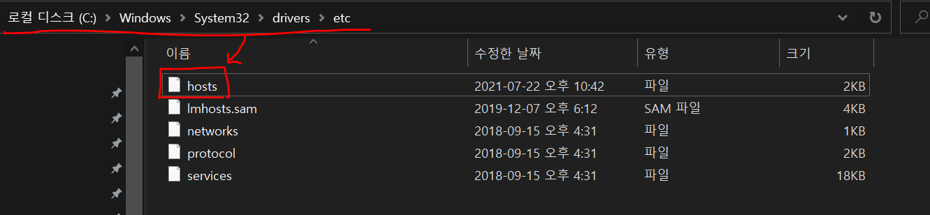windows 기준으로 hosts파일의 위치는 C:\Windows\System32\drivers\etc\hosts 다.